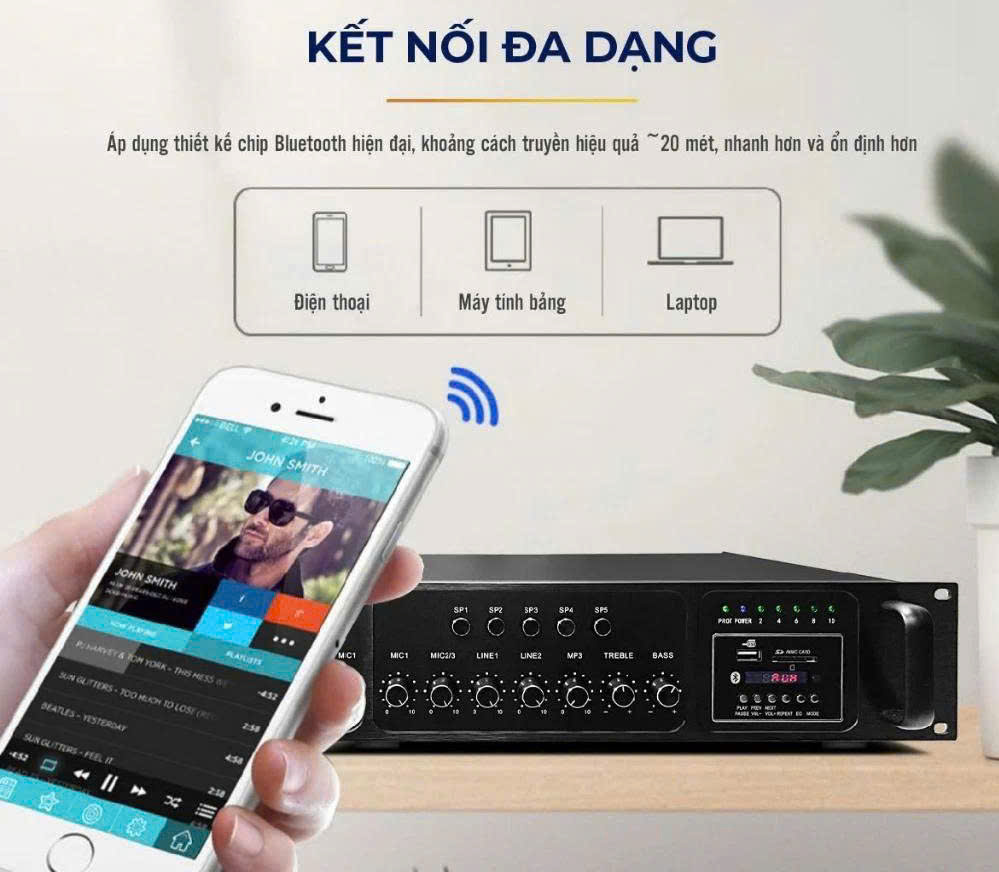 - Amply thông báo dành cho loa phóng thanh và loa âm trần sử dụng phát thông báo, phát nhạc MP3, trò chuyện nơi không gian rộng
