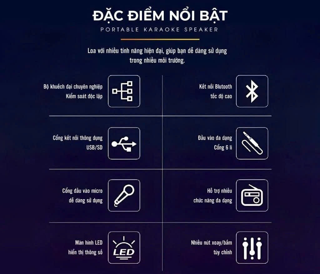 - Hỗ trợ kết nối: Bluetooth, AUX, Thẻ SD, USB, phát nhac MP3