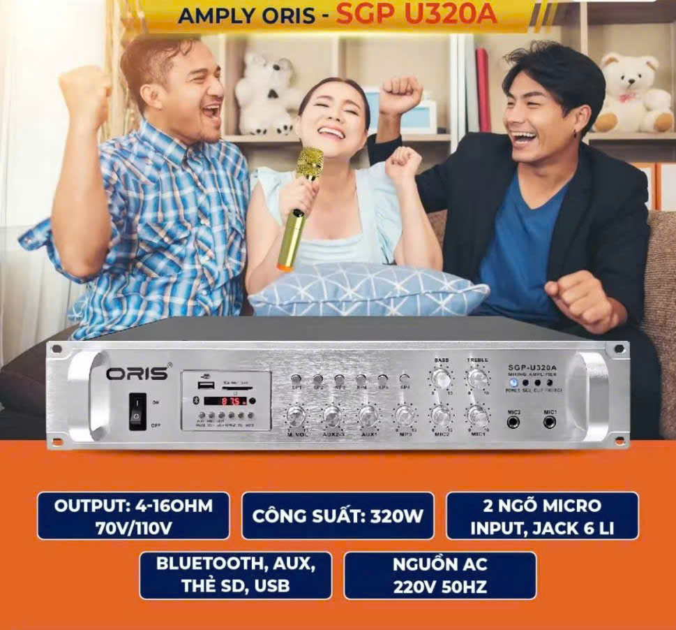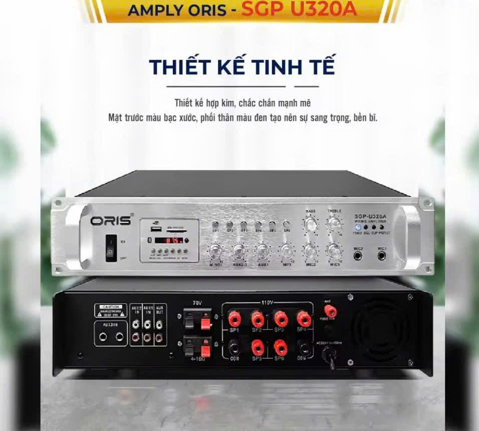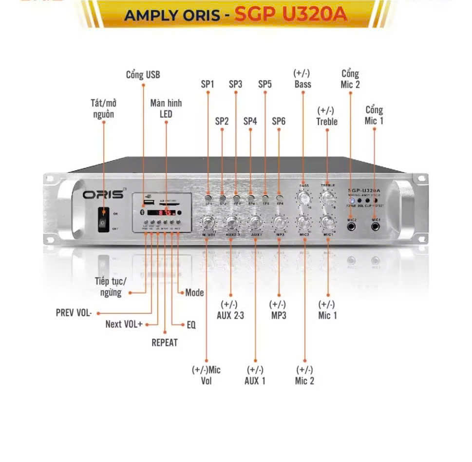 - Amply Oris SGP-U320A là amply liền mixer, mặt sau Amply có 2 ngõ vào cần bằng cho micro, 2 ngõ vào AUX và 1 ngõ Out