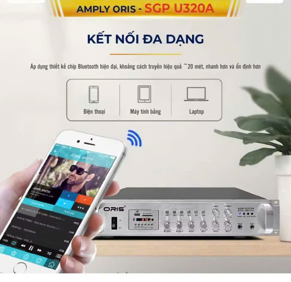 - Amply Oris MP3-U320A thích hợp với loa âm trần, loa treo tường, loa cột… trong cùng một hệ thống âm thanh công cộng