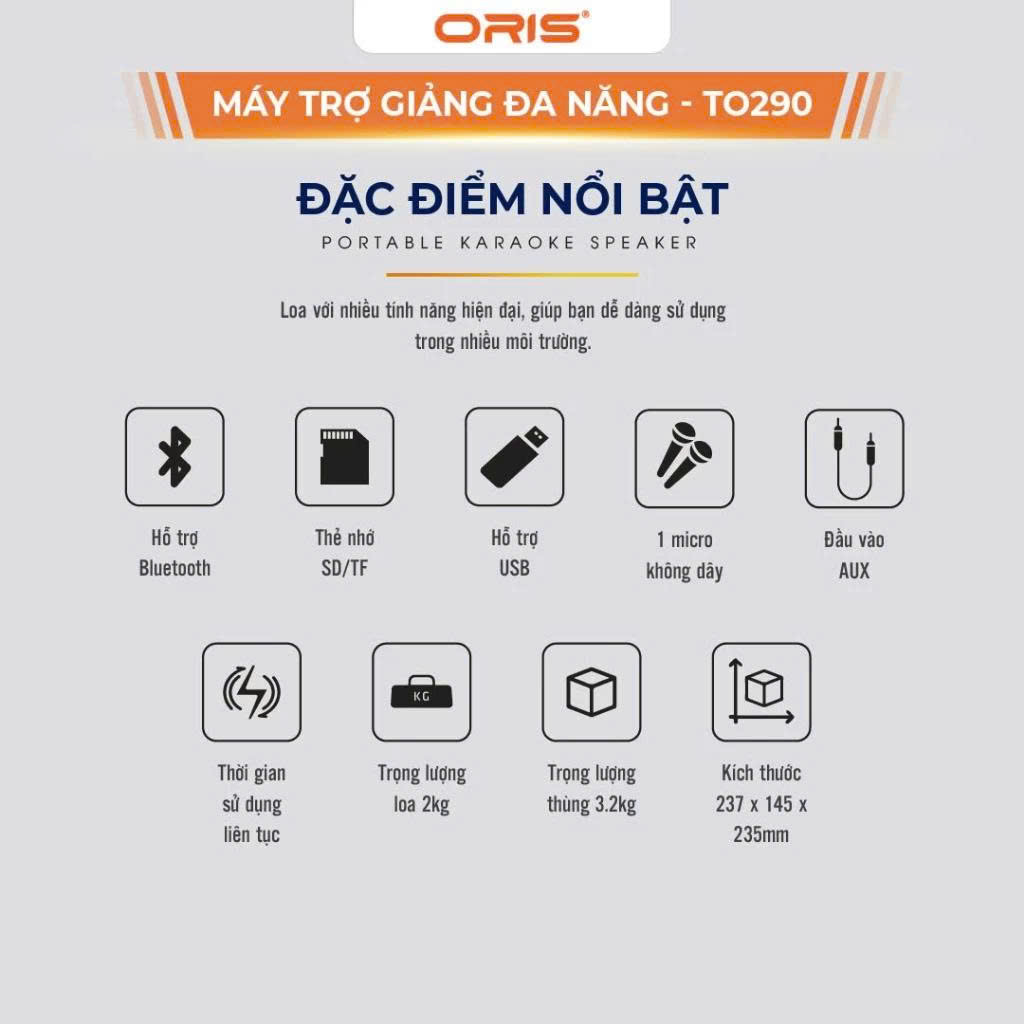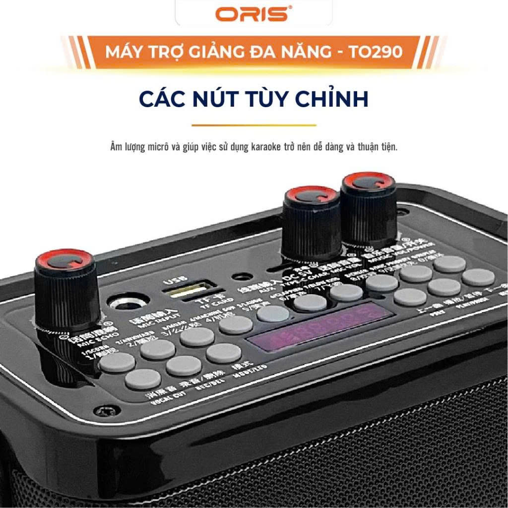 Kiểu dáng nhỏ gọn với trọng lượng vừa tầm tay người xách: Các cô giáo, thầy giáo giờ đây không phải vất vả xách cả một thùng loa to vừa mất thẩm mỹ lại vừa bất tiện. Với ORIS TO-290 một chiếc máy trợ giảng nhỏ gọn khi giảng, có thể đeo bên hông và cũng có thể đặt trên bàn, khi dùng xong thì có thể cất gọn vào túi xách.
