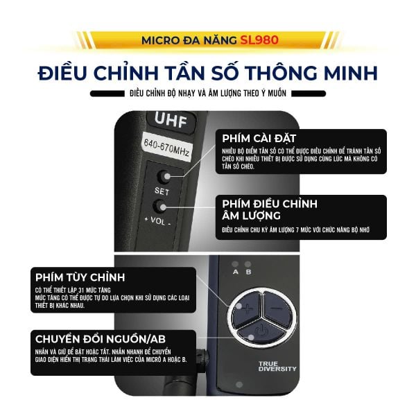 - Kết nối đa dạng: Công nghệ UHF với 50 kênh, chống hú, rè, trùng tần số.