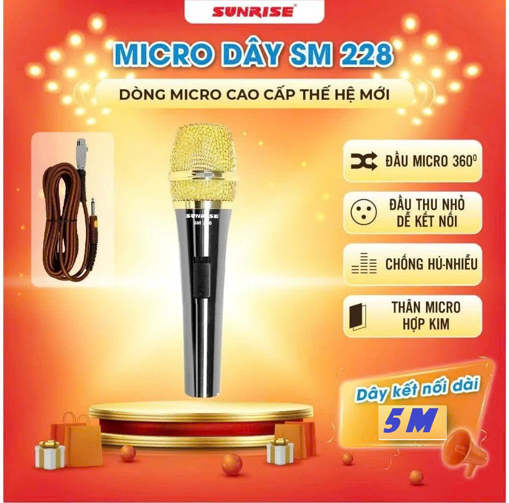 Micro karaoke Sunrise SM 228 được ưa chuộng là dòng micro karaoke gia đình hay , micro cho âm thanh trong trẻo nhờ cấu tạo màn lọc kim loại ứng dụng công nghệ lọc kép cho âm thanh trong trẻo bay bổng.