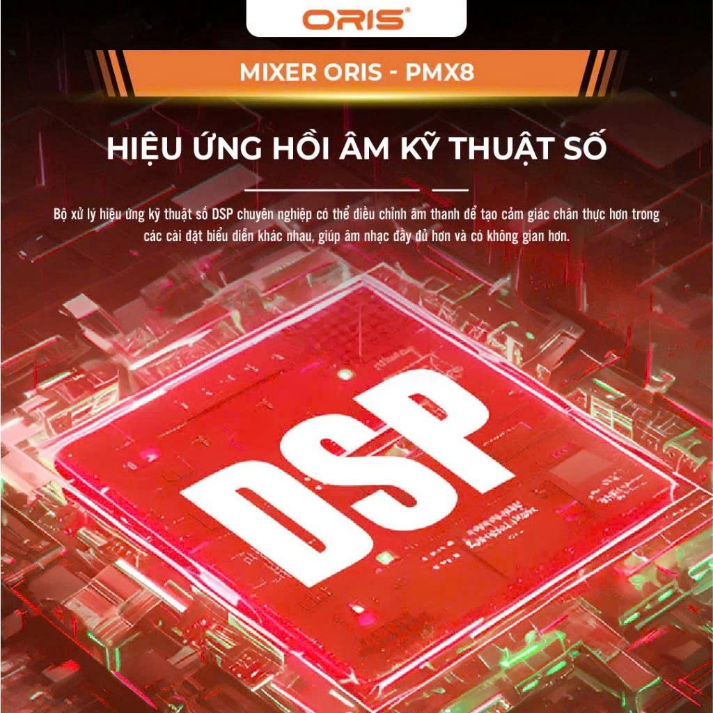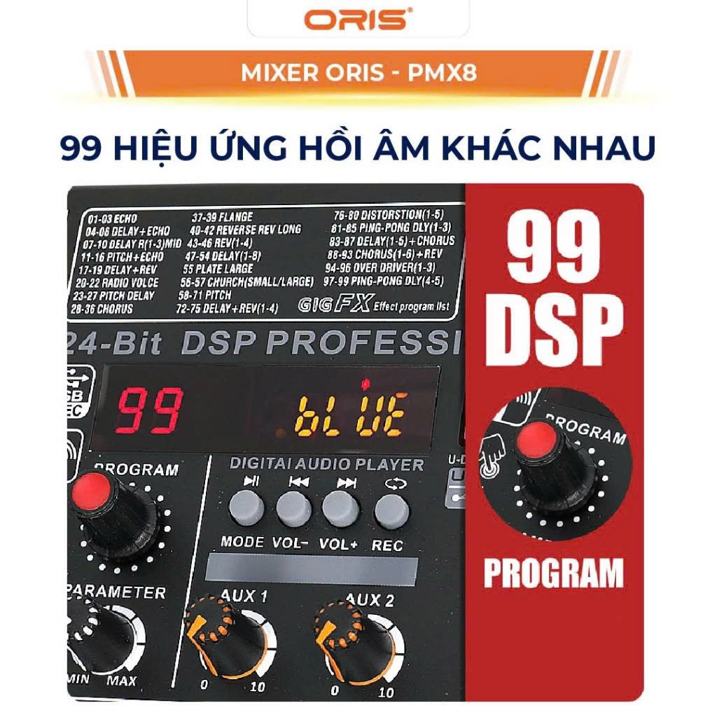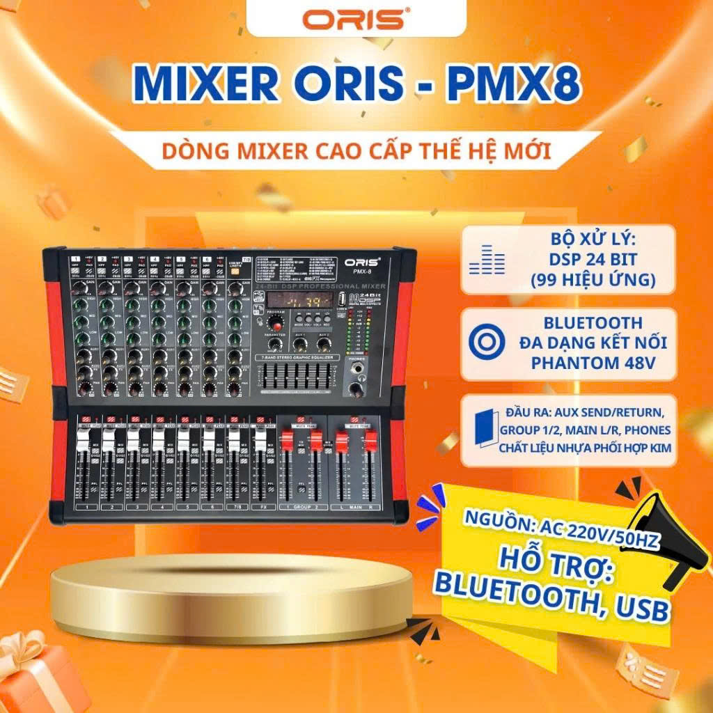 Mixer ORIS PMX8 - (6 Mono1 Stereo), Có Công Suất, DSP 99 Hiệu Ứng, BluetoothUSB, Phantom 48V